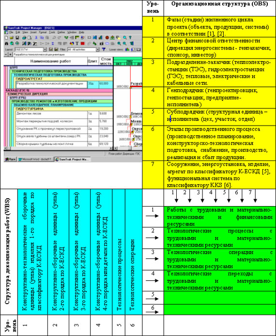 Для организации работ, распределения ответственности, оценки стоимости, системы отчетности в процессе построения матрицы ответственности, формирования статей затрат и определение основных вех проекта в ИАСУПр "РЕМИЗ+" используется структура декомпозиции работ (WBS - Work Breakdown Structure) [3] и структурная схема организации (OBS – Organization Breakdown Structure) [3], приведена в таблице 2.