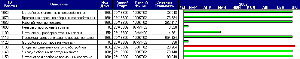 Посмотреть пример сооружения мостового перехода после выполнения передачи данных из сметы (до ввода зависимостей).