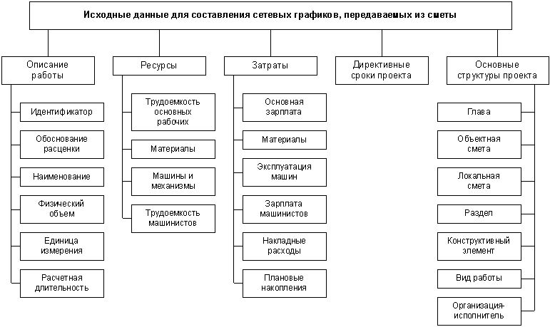 Строительные сметы содержат полный состав работ по сооружению объекта, информацию о ресурсах, цены и объемы работ. Если дополнить эту информацию технологической последовательностью работ, временными и ресурсными ограничениями, на основе данных сметы можно сформировать график производства строительно-монтажных работ, который позволит проанализировать сроки выполнения проекта в целом, использование как материальных, так и трудовых ресурсов, потоки денежных средств. После согласования директивный график служит основой для координации участников проекта, контроля его выполнения, планирования поставок материально-технических ресурсов, оперативного управления.