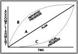 Рассмотрим диаграмму. Линия А показывает план: работы выполняются, проект непрерывно двигается вперед с предполагаемым завершением в марте. Линия B показывает отчетное продвижение без учета объективных фактов: " Хорошо, я сообщу, что мы сделали больше, еще времени впереди много, успеем все наверстать." Линия C показывает реальность: медленное начало, минимальное продвижение проекта до начала паники, а затем "лихорадочные скачки" к финишу.
