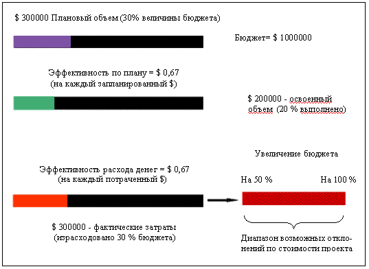 (Один из первых выводов, который можно сделать на основании анализа данных методики освоенного объема заключается в возможности уже на ранних этапах реализации проекта – по завершении первых 15-20% от общего объема работ – откорректировать плановые показатели. Если рассмотреть весь период реализации проекта как один полный цикл, в какой части этого периода обеспечивается более точное планирование? Конечно в начальный период, и надежда на лучшее в более поздние периоды. Далее, если в бюджет проекта жестко ограничен, для какого периода он корректнее распределен – для раннего или позднего? Конечно, для раннего. Каждый человек, планируя, лучше продумывает начальный период и, по возможности, надеется на благополучный исход в конце. Таким образом, результаты методики освоенного объема реальны и значимы даже на ранней стадии реализации проекта, скажем, после первых 15% жизненного цикла проекта.)