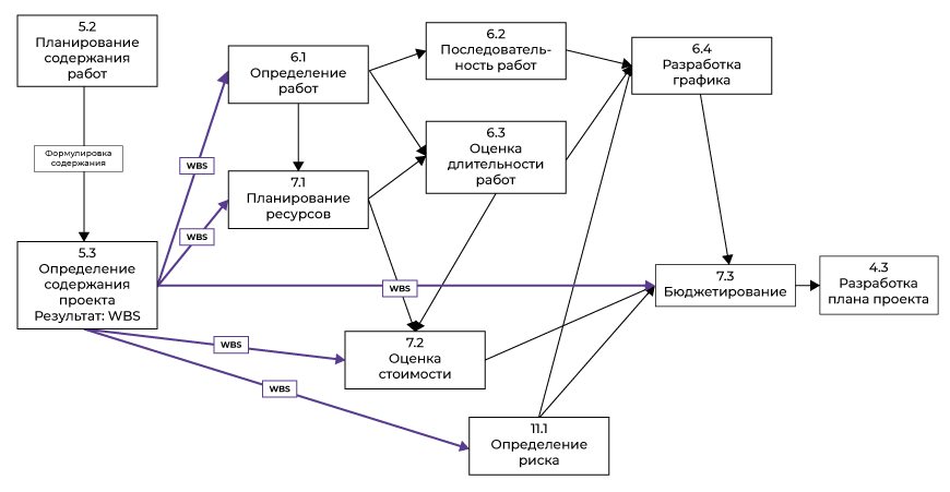Рис.3.5 в PMBOKGuide (в данном документе воспроизведено частично и изменено см. Рис. 2‑1) иллюстрирует, как проект разворачивается вокруг WBS. WBS является основным «стрежнем» для четырех основных и одного вспомогательного процессов: