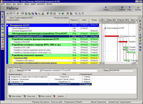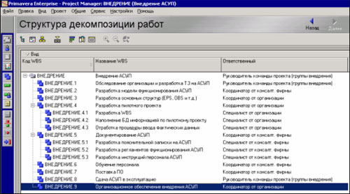 Итак, содержание проекта внедрения известно и команда проекта сформирована. Соответственно, можно сформировать структуру декомпозиции работ (далее СДР) по созданию АСУП. Следующим действием должно явиться закрепление ответственных из числа команды проекта за те или иные пакеты работ из состава СДР – формирование так называемой матрицы ответственности. Ускорить выполнение данной задачи можно с использованием программного продукта Project Manager (далее РМ) серии Primavera Enterprise разработчика фирмы Primavera Systems (Рис. 2).